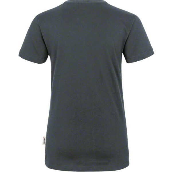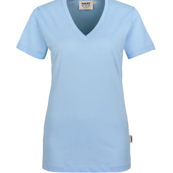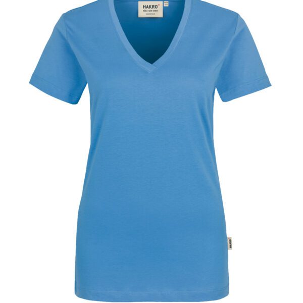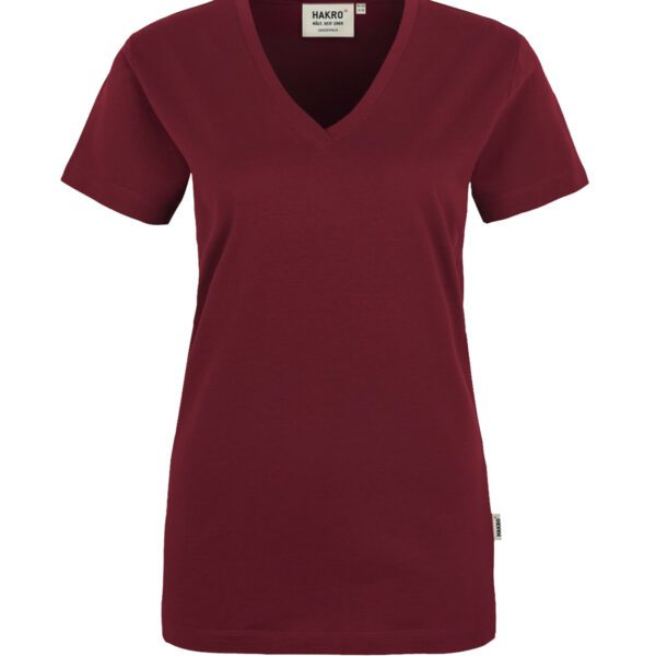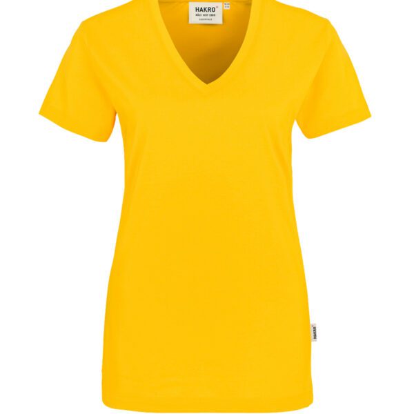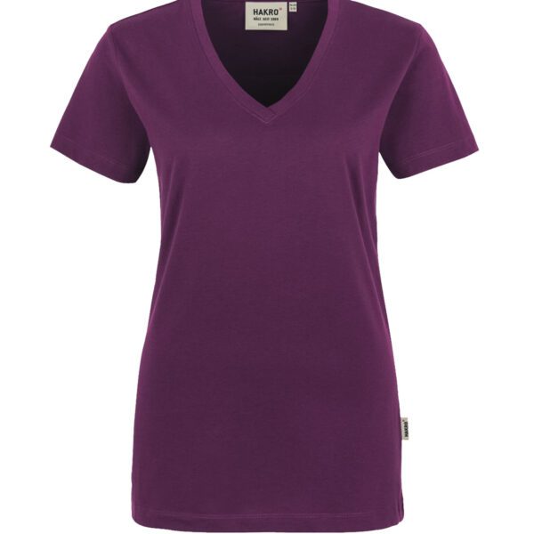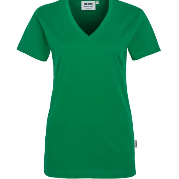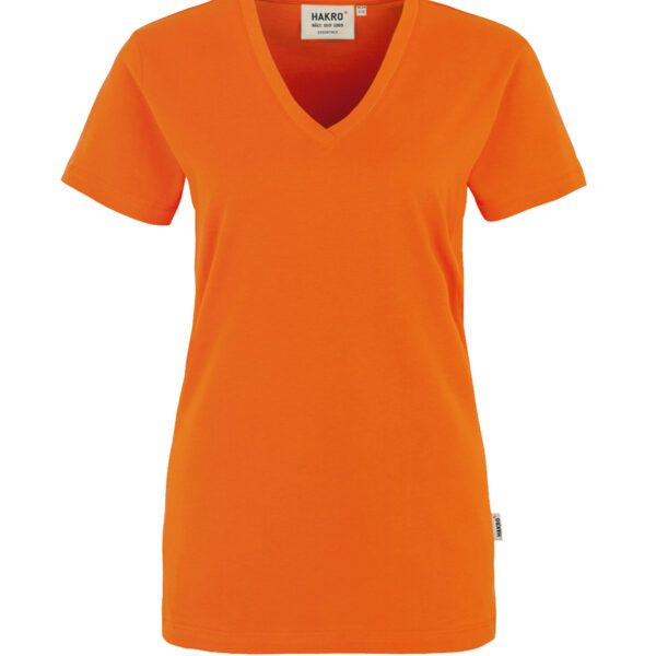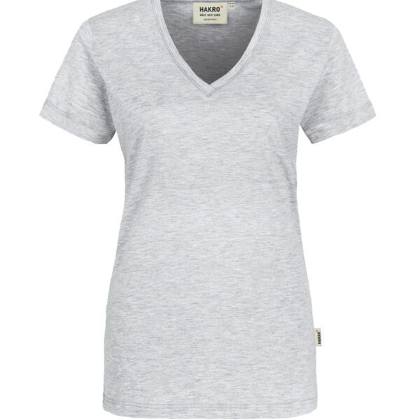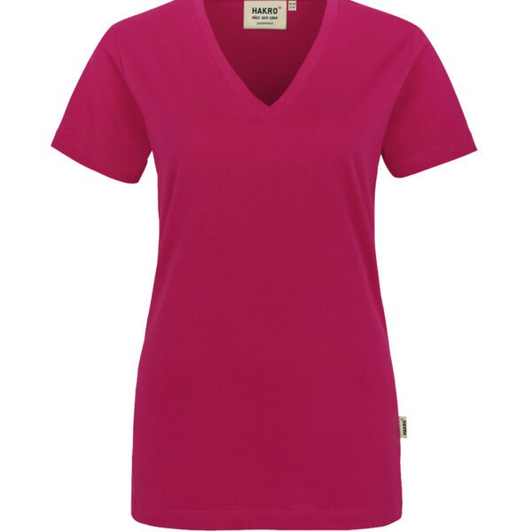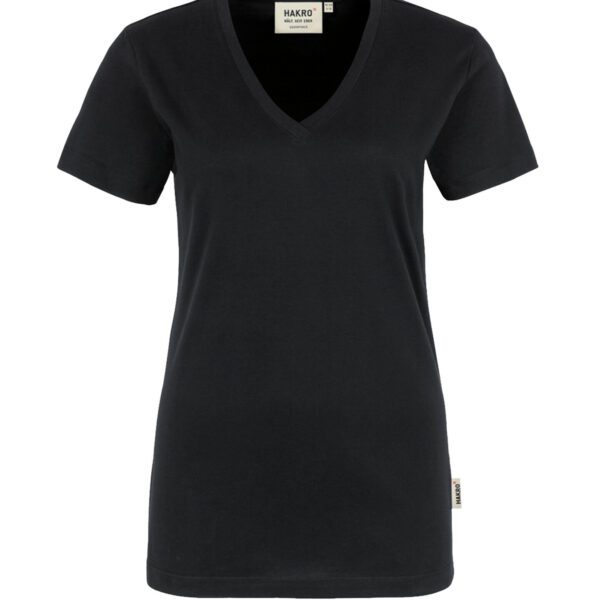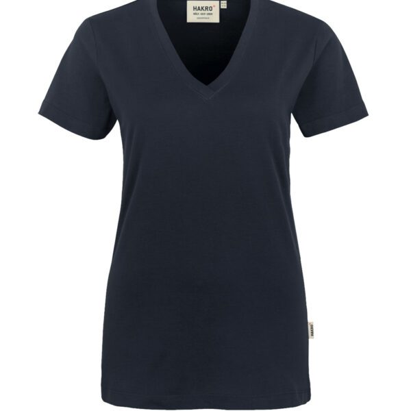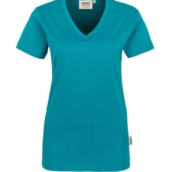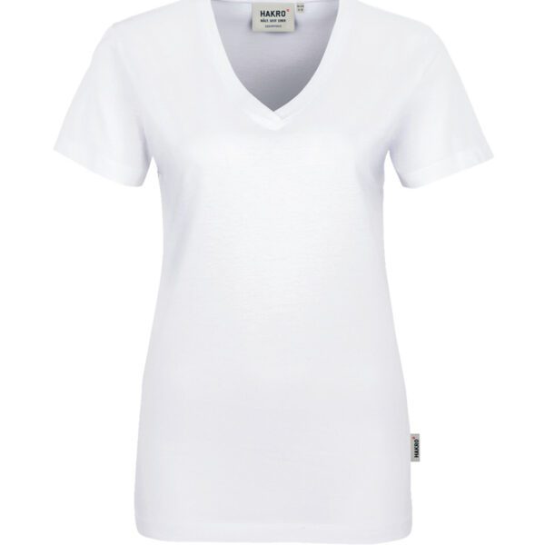 Klassisches T-Shirt für Damen, mit feminin geschnittenem V-Ausschnitt, modisch schmalem Halsbündchen und Nackenband. Hergestellt aus feinem, mittelschwerem Single-Jersey aus langstapeliger, gekämmter und ringgesponnener CmiA-Baumwolle. Gewebtes HAKRO Necklabel aus hochwertigem Kettsatin mit weichen, ultraschallgeschnittenen Bandkanten für höchsten Tragekomfort und gewebtes HAKRO Flaglabel an der linken Seitennaht.