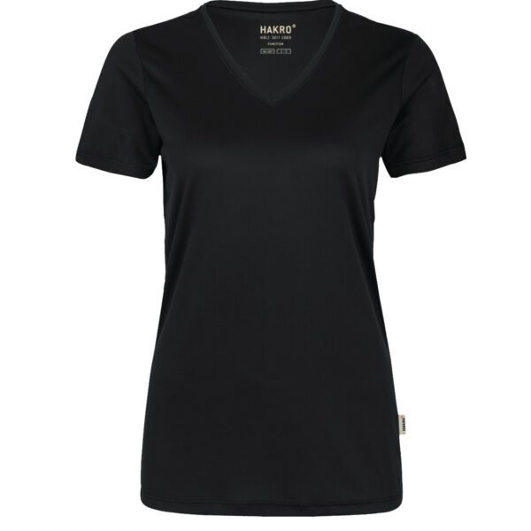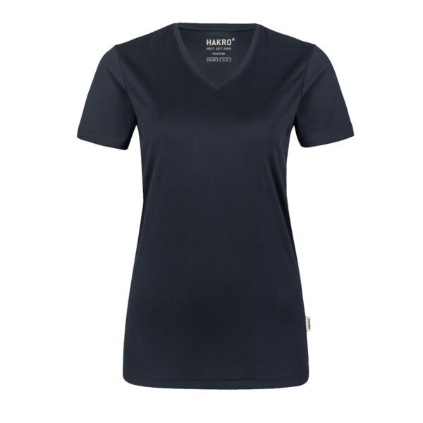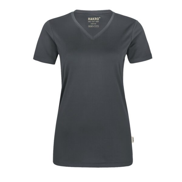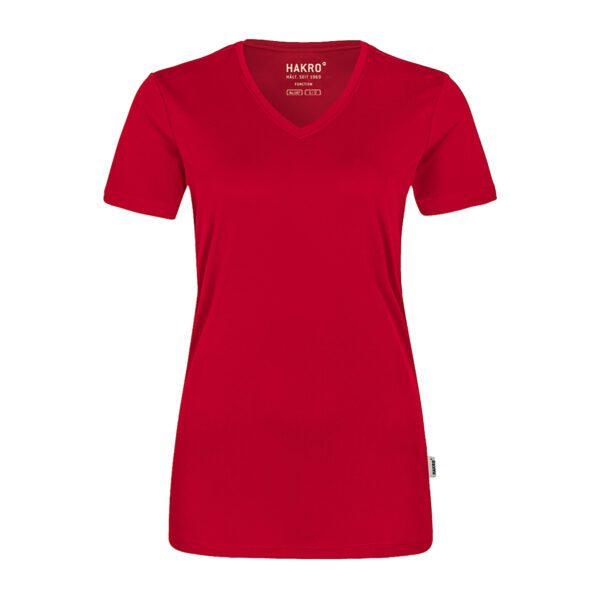 Funktionelles T-Shirt für Damen, mit feminin geschnittenem V-Ausschnitt, verlängertem, abgerundetem Rückenteil und Nackenband. Hergestellt aus COOLMAX® PRO – einer Funktionsfaser für extreme Belastungen. Temperaturregulierend durch schnellen Transport der Feuchtigkeit an die Textilaußenseite, wo sie sofort verdunsten kann. Gedrucktes HAKRO Necklabel für höchsten Tragekomfort und gewebtes HAKRO Flaglabel an der linken Seitennaht.